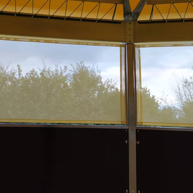 Made of marine plywood panels attached to galvanised steel columns. The PVC-coated fabric cover is available in white, green, or cream